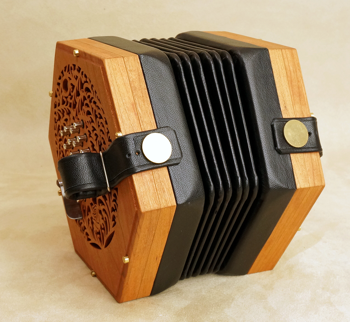 Concertina Connection Rose45-key treble, serial #166. Natural finished cherry ends, metal buttons, riveted action, Italian accordion-type reeds, and leather Wakker 6-fold bellows. Range: g - a3. With unfitted hardshell case. Video. New |