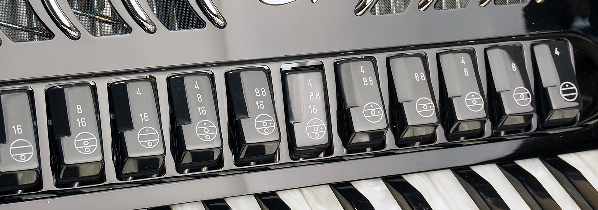 Brandoni 144CA top-of-the-line model from one of Italy's premier makers. 96 bass, 34 treble (g - e3), 4/5 sets of handmade reeds (Artigiana, LMMH). Double tone chamber, 11/7 switches. Cassotto-style bass reedblocks. Pearl keys & bass buttons. 16" keyboard; overall measurement 17½" x 7½". 23 lbs. With backpad, deluxe straps, and rolling hardshell case. Video 1, Video 2. |