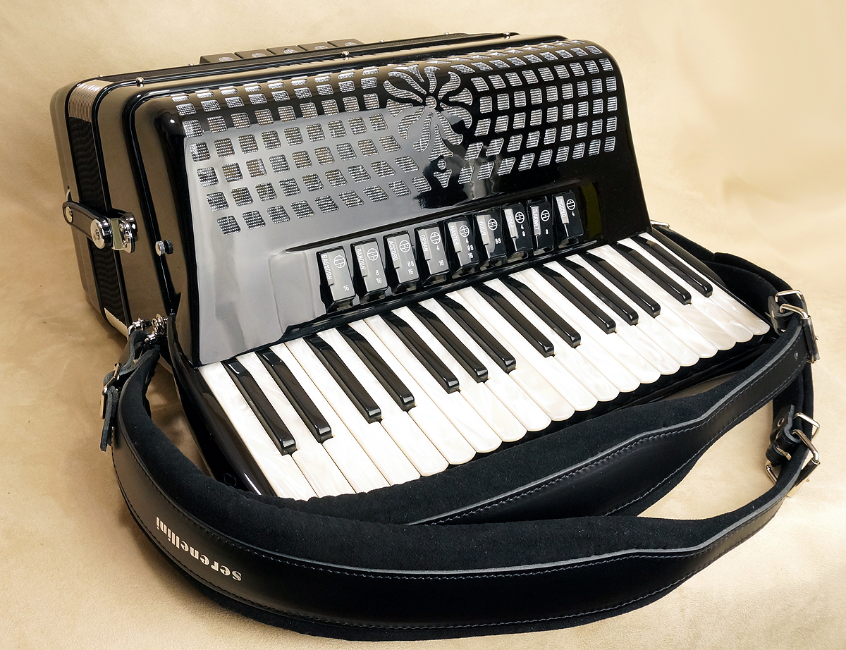 Serenellini Cassotto Opera 41 2+2120 bass, 41 treble, 4/5 sets of special handmade reeds (Artigiana) with a double tone chamber, 13/7 switches plus palm master. Choice of solid cherry or mahogany with natural finish. Full-size keyboard. 25.6 lbs. With case and straps.
